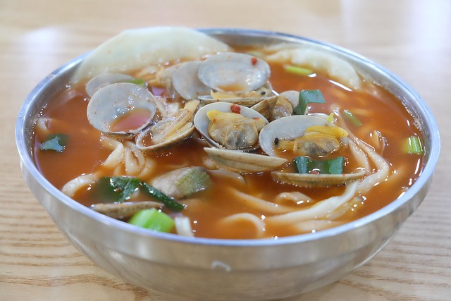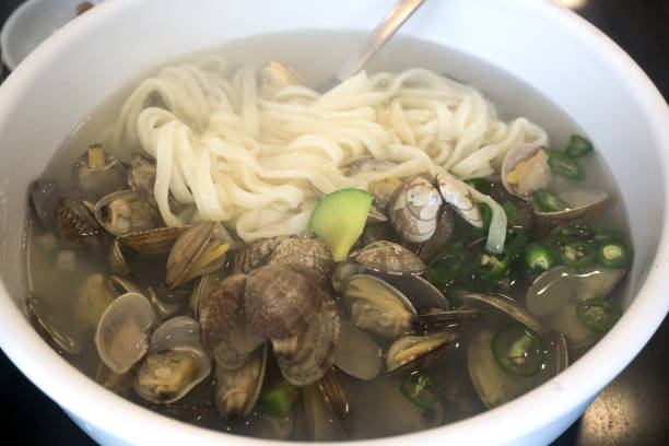 - 바지락을 넣고 끓인 후, 면을 넣고 5분간 익힌다.